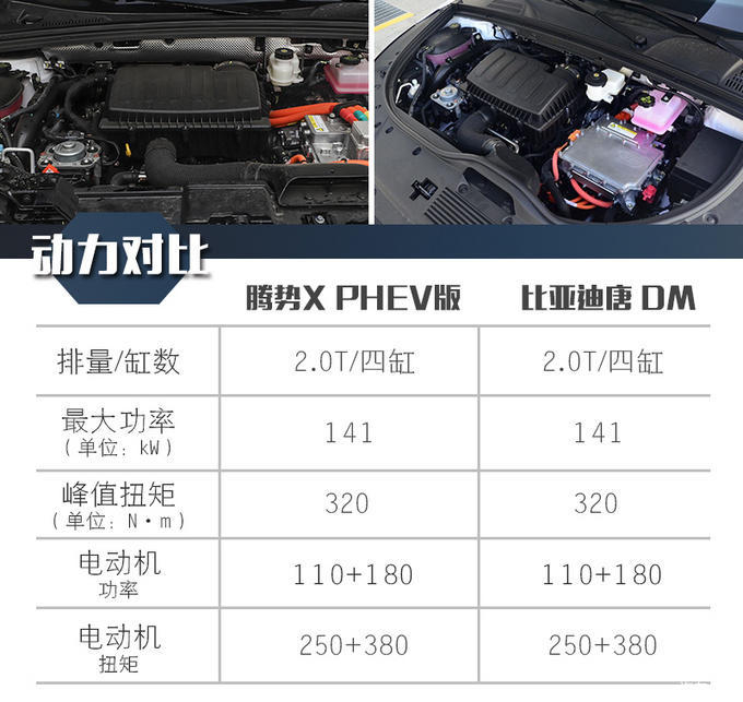 第二个实锤是在于完全一致的动力总成,比亚迪唐新能源分为插电混动版和纯电版一共两个版本,腾势X也是一样。就以我们今天对比的插电混动车型来看,几乎所有与动态有关的硬件:发动机/变速箱/前后电机/差速锁器都完全一致。悬架硬件基础也完全一致,结合两者相差无几的尺寸,可以得出两者基本上就是一台车的结论。