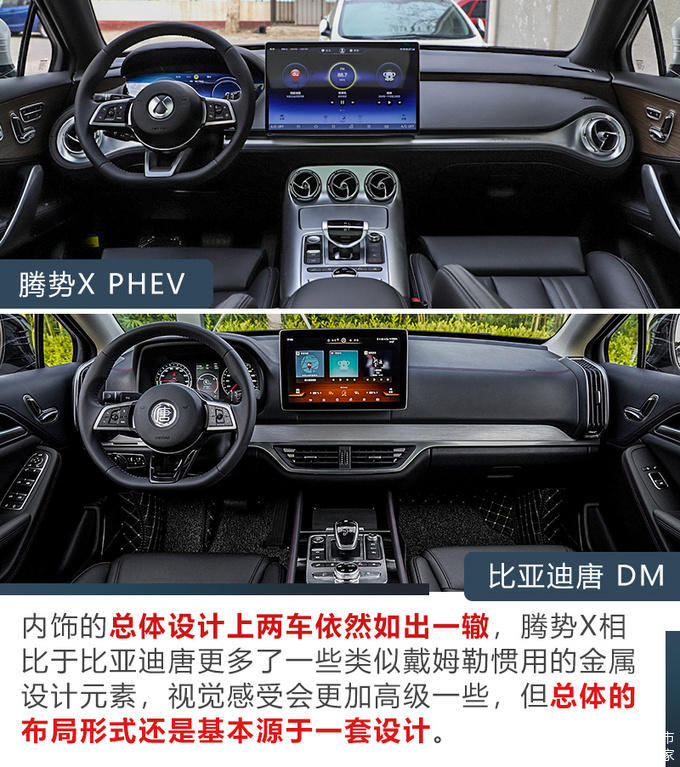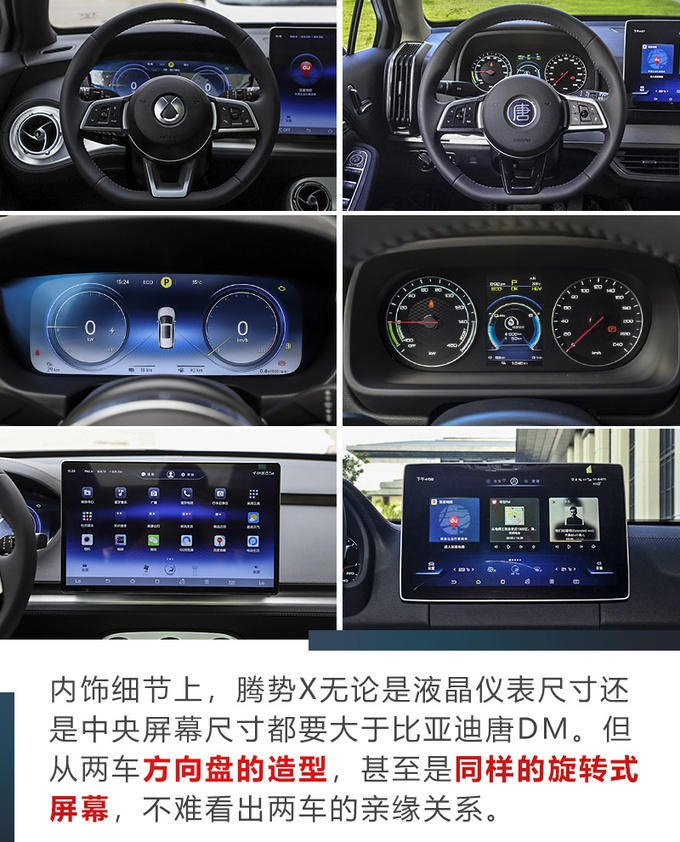 和外观一样,内饰设计上腾势X和比亚迪唐DM在基本的设计“大面儿”上保持一致,旋转式的人机交互界面依旧抢眼。但眼尖的消费者定睛一看,还是能看出腾势X是基于比亚迪唐DM进行打造的。在细节设计上,类似内饰板/空调出风口等地方体现了一丝丝的“奔驰德味儿”。从配置的实用性出发,整体上同价位比亚迪唐DM的配置水平高于腾势X,空间体验和座椅舒适度则完全一致。