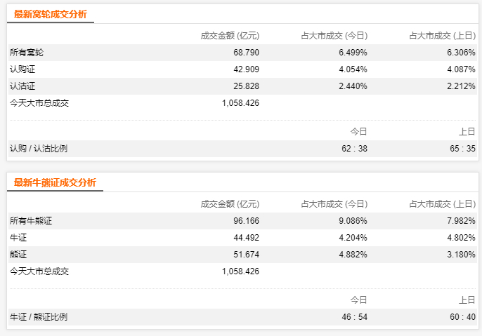 今日涡轮总成交68.79亿港元,其中认购证成交42.909亿港元,认沽证成交25.828亿港元;牛熊证总成交96.166亿港元,其中牛证成交44.492亿港元,熊证成交51.674亿港元;所有涡轮牛熊证合计成交164.956亿港元,占大市成交15.58%。