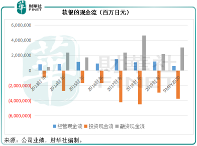 见下图,相对于经营活动的净现金流入金额,投资活动的现金流出额要大得多,所以软银基本上通过融资活动来满足这些资金需求,见下图灰柱。
