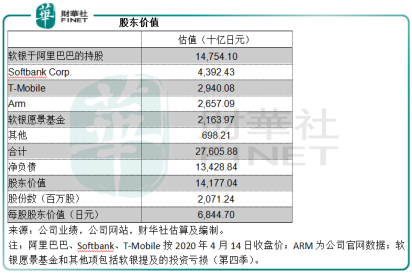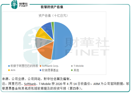 财华社按照其最新交易所报价、2019年12月31日业绩数据以及软银刚刚发布的业绩预警(即投资亏损),估算出软银的合计资产价值或为28.232万亿日元,其中于阿里巴巴的投资价值为14.754万亿日元,占了52.26%。