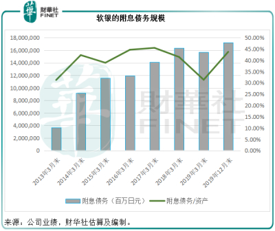 截至2019年12月31日,软银的总资产为39.406万亿日元,附息债务为17.234万亿日元,总资产与母公司股东应占权益之比率由2019年3月末的4.74倍上升至5.12倍,反映杠杆水平上升。