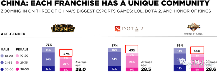 即使在电竞领域里,小姐姐们也是颠覆我们的传统观念,在Newzoo发布的2019年全球电子竞技市场报告中,以对抗竞技为主的三款经典MOBA类游戏《英雄联盟》、《DOTA2》、《王者荣耀》,中国市场的观众群体中很大一部分就是这些平日里文文静静的小姐姐们。其中,《王者荣耀》女性观众占比最高,达到44%;紧随其后的是《DOTA2》,占比43%;《英雄联盟》最低,但女性观众占比也接近3成。