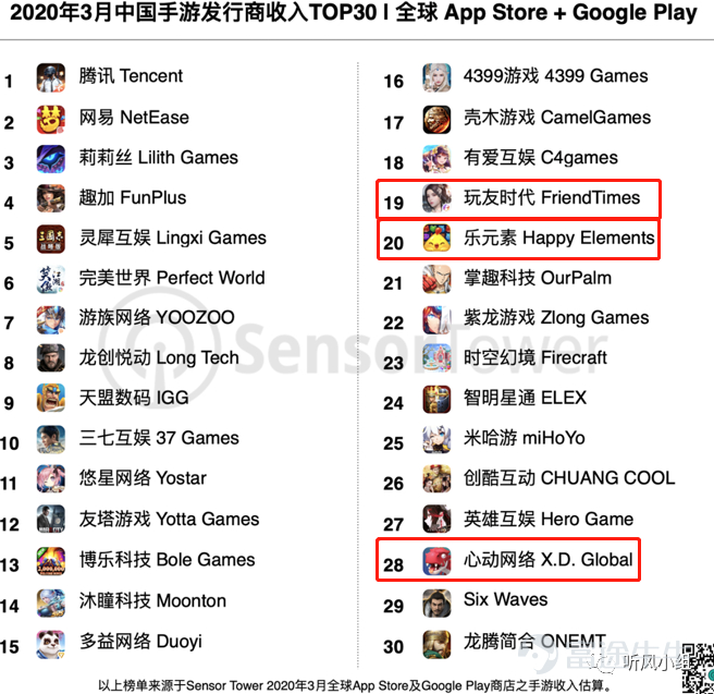 排名28名的心动公司(02400.HK)1月初在港台地区发布宫廷手游《蓝颜清梦》,3月份实现80%的增长,带动公司收入增长15%;15年在日本发行《偶像梦幻祭》的乐元素,3月初在日本发行了该作同名音游《あんさんぶるスターズ!!Music》,使得公司收入环比增长53%。