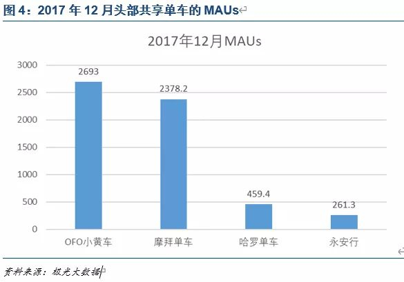 在资本的强力驱动下,OFO和摩拜在活跃用户等数据上处于领先地位。按极光大数据显示,ofo小黄车和摩拜单车在2017年12月 MAU都突破了2000万人,ofo 12月MAU为2693万人,摩拜单车为2378.2万人。