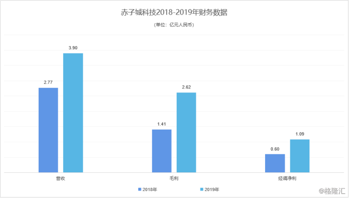 根据上个月发布的财报,2019年度,赤子城科技收入达3.90亿元,同比增长40.8%;毛利达2.62亿元,同比增长84.9%;经调整净利润达1.09亿元,同比增长82.3%。