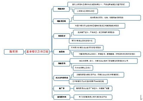 八大公司组成了海底捞强大的供应链。对于餐饮行业来说,供应链是至关重要的,餐饮连锁品牌的快速规模化发展,没有产业价值链的贯通是很难实现的。