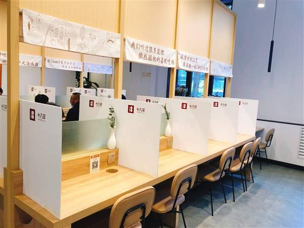 店内有4人桌、2人桌与供1人食的长桌,目前长桌都已经用白板隔离出单人的就餐位,每个配置上还配有充电插头和建议顾客“自主回收餐具”的标语。这家店还设置了面食外卖与茶饮外卖两个窗口,但因疫情原因暂不开放。