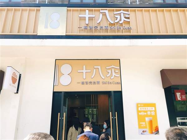 十八汆的首店是酒仙桥地区的一个临街店铺,周围办公区密集。虎嗅在工作日中午12店左右来到门店,虽然仍在疫情期间,但店门口已排起队来,足以见得人气颇旺。