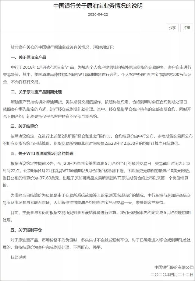 中行表示,对于原油宝产品,市场价格不为负值时,多头头寸不会触发强制平仓。对于已确定进入移仓或到期轧差处理的,将按结算价为客户完成到期处理,不再盯市、强平。