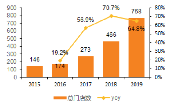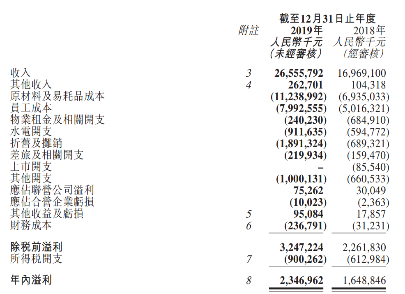 据海底捞2019年年度报告显示,全年实现营业收入265.56亿元,同比增长56.24%;实现归母净利润23.45亿元,同比增长42.44%。门店数量也从2018年末的466家增长到2019年末的768家,其中新开业308家,因租约到期和其他商业原因关店6家,净开业302家。