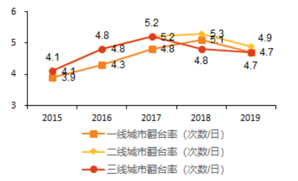 值得注意的是,据天风证券研究所数据显示,三线城市和一二线城市的翻台率分别在2017年和2018年达到5.2次/天、5.1次/天和5.3次/天的高点后,开始呈现下滑态势,某种程度上显示了对顾客的吸引力下降。