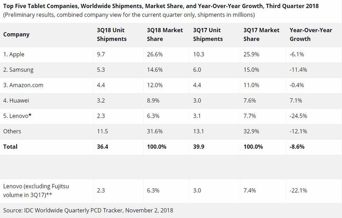 其次是安卓平板市场集体式微,市场调研机构IDC统计的数据显示,2018年Q3全球平板电脑出货量为3640万台,较去年同期的3990万台下降了8.6%。至今为止,平板市场已经连续16个季度出现同比下滑。