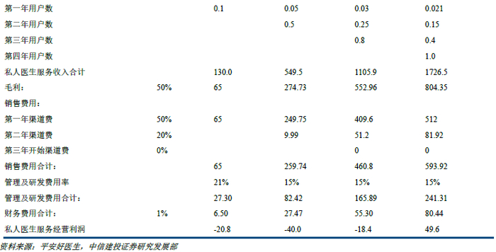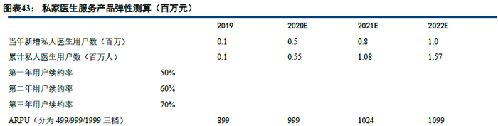 私家医生是平安好医生在2019年8月发布的战略级产品,面向所有用户,提供线上1对1私家医生微信问诊以及线下名医会诊等服务,根据服务范围收取会员费499元/人–1999元/人不等,上线4个月以来人均问诊量是普通用户的2.7倍,私家医生会员处方支付转化率以及下单量分别是普通用户的2.3和2倍。同样具备订阅服务模式的特性,目前私人医生服务还不到盈利阶段。考虑到私人医生服务是19年8月份才正式推出,相关运营数据比较有限,我们基于不同的用户数增量假设和单用户价值贡献的假设对公司业务做了一个简单的敏感性分析,核心变量是续费率、渠道费用率、单用户价值以及每年新增用户数等,预测至2020年私人医生服务有望贡献5.5亿元左右收入,但前期处于亏损阶段,一旦形成稳定可持续的用户群,这将会是一个很好的现金流业务。