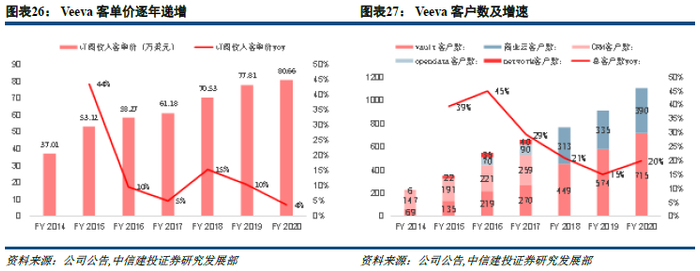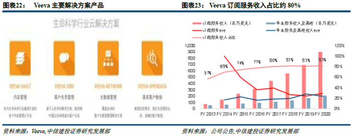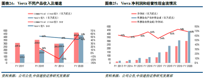 Veeva是医药、生命科学垂直领域名副其实的SaaS平台领军者,其客户涵盖制药、生物技术、医疗产品、CSO(合同销售组织)和CRO(合同研究组织)等领域,自2007年成立以来,Veeva的客户几乎囊括了Top20的制药企业,目前Veeva的产核心产品为Commercial Cloud以及Vault Platform两大平台,其中Veeva Commercial Cloud是公司的传统产品,在2020财年收入5.3亿美元,同比增长16%,专为生命科学与制药企业打造的整合客户数据、合规内容和多渠道互动信息的综合性商业解决方案,截至2019年公司在医药CRM领域市场份额占比已超过80%。而公司当前成长性主要来源的另一产品Vault,是一套统一的基于云的企业内容和数据管理应用程序,可满足客户内容管理要求,包括医疗、销售和营销以及关键的研发职能,2020财年实现营收5.7亿美元,同比增长43%,市场渗透率尚不足10%,仍处于快速增长的阶段,未来还有较大发展空间。整体来看公司订阅服务收入2020财年实现8.96亿美元的收入,占公司总收入的81%,同比增长29%,公司整体总毛利率为73%。