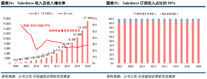 Salesforce成立于1999年,在经历了近20年的发展以后,成为CRM SaaS全球领军者,Salesforce的产品体系整体分为七大部分,包括:销售云、服务支持云、市场销售云、社区云、平台与应用程序云、分析云以及IOT云平台服务,收入主要来源于两个部分:订阅与支持服务和其他专业服务收入,2020财年公司订阅和支持收入为160.4亿美元,占总收入的93.8%,订阅和支持收入的增长主要是由新业务量的大量增加所致,其中包括新客户升级和现有客户的额外订阅。