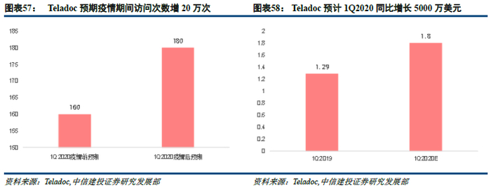 Medicare在疫情期间暂时覆盖远程医疗,Teladoc平台访问增长迅速。再看美国,自2月底出现第一例新冠死亡病例,至3月13日特朗普宣布由于新冠疫情进入国家紧急状态,到4月中旬美国已累计确诊67万多例,死亡3万多例,2020年3月17日特朗普政府表示,针对受益人的医疗保险将暂时覆盖远程医疗服务,这是针对新型冠状病毒引起的COVID-19的最新政策变更,在此之前,Medicare从未涵盖过这种程度的虚拟护理服务,这一举措在疫情爆发前如Teladoc和American Well等远程医疗公司就已经提出过要求,现在得以实现,虽然这一改变只会在COVID-19国家紧急状态被指定时才会实施。对此Teladoc的CEO也表示新用户的涌入将推动访问量的增长,有助于Teladoc的营收,疫情期间Teladoc Health访问的60%以上是平台新用户,预计1Q2020有超预期20万次访问,即总访问量超过180万,比去年同期增长70%,对于新增的20万次访问公司预计付费率50%,则将有500万美元营收增加,整体来看1Q2020整体营收约1.8亿美元,同比增长40%。