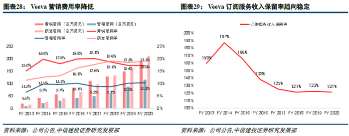 首先,Veeva的客户ARPU持续提升,截至2020财年,公司订阅收入客单价达80.66万美元,同比增长约4%,年复合增长率13.9%,目前公司两大功能平台合计产品模块近30个,而当前企业用户平均使用数仍不足20%,仍存在持续拓展空间,且Vault产品毛利率更高,随着在企业内容管理方面渗透率的提高,未来Veeva总体利率情况有望进一步改善;其次,高订阅服务收入保留率也反映出公司良好的产品竞争力及用户满意度高,近四年来Veeva的订阅服务收入保留率稳定保持在120%以上的水平,这意味着几乎没有重要客户的流失,2020财年研发费率从2015年的13%增长至19%,这是留住客户群体的重要手段。总体看来公司2015年毛利率水平为63%,随着后续收入增长带来的规模效应及高毛利产品的占比提升,公司毛利率水平逐年上升,2020财年毛利率增长至73%;最后,Veeva获客成本在2020财年小幅下降,经测算Veeva的LTV/CAC指标约为13.36,相比同行业SaaS服务商,客户生命周期价值及粘性很高。