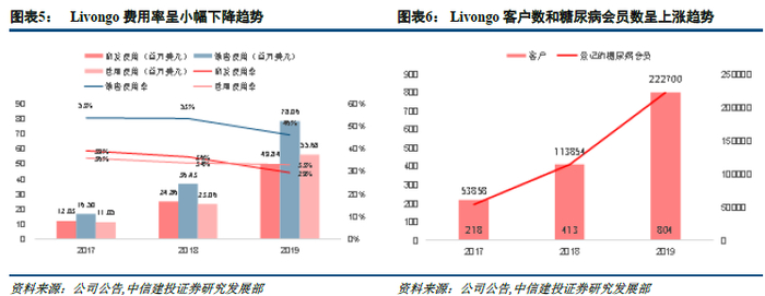 Livongo基于B2B2C的商业模式,主要客户是为员工购买医疗保险的企业,而保险公司和PBM(药品福利管理)是帮助推荐客户的渠道商,真正享受Livongo创新服务的企业员工则被称为会员。Livongo的解决方案是一种软硬件加人工服务的组合,目前已经推出了四种解决方案,分别是糖尿病、高血压、糖尿病前期和体重管理、以及行为认知和压力管理,其中,糖尿病业务占目前总营收的90%以上。截止2019年12月31日,Livongo已经拥有804个客户,22.3万名会员,2019年新增会员近11万人,20%的客户来自财富500强,美国最大的7个健康医疗保险中的4家和最大PBM中的2家是其合作伙伴,95%的客户留存率,以及150%的年度营收增长率,这些数据表明公司取得了渠道商和客户的信任及认可,目前公司的营收正处于高速增长期。