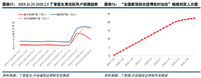 疫情期间22.4亿流量将极大促进丁香医生To C端业务的发展。自疫情发展以来,丁香园便开辟新冠肺炎疫情实时动态专栏并于第七周次(以2019.11.25-2019.12.01为第一周次计数)上线,截至2月18日共获得了22.39亿的浏览人次,在链接上线的那一周,其新安装用户数从1.93万暴增至10.66万,增长率达452.33%,活跃用户数从4.22万人增长到13.94万,同比增加230.33%,日均活跃用户数从2.18万增加到7.95万,同比增加264.68%,至3月19日,疫情期间丁香园旗下主要媒体渠道共发布科普性内容3600多条,累计阅读量40亿次,用户查看“新冠肺炎”单疾病词次数达1亿次。虽然这些各类爆发式增长的指标离不开疫情发酵对互联网医疗的促进作用,但在实时动态链接上线后实实在在地提升了丁香系的渠道影响力以及品牌口碑,并将用户引流到了移动应用端,丁香医生本身定位就是聚焦于健康领域,以“内容+流量+商业开发”为核心模式,相信流量数据的增长,将大大促进香医生To C端业务的发展。