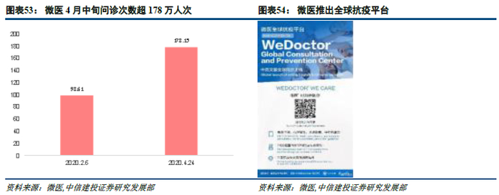 微医互联网医疗平台累计访问量超1.3亿人次,提供在线咨询和诊疗服务超178万人次。2020年1月23日微医率先在国内推出提供在线义诊服务的“新冠肺炎实时救助平台”并挺进武汉,为全国用户提供免费在线咨询、心理救助、在线复诊、医保用药和防疫科普等服务,到4月中旬,累计访问量超过1.3亿人次,上线医生5万多名,为全国提供免费在线咨询和诊疗服务超178万人次,通过线上平台筛查最终确诊了140多名新冠肺炎患者。3月14日,微医全球抗疫平台上线,首批6129位来自国内三甲医院的呼吸内科、感染科、全科等科室的主治及以上医师参与海外救援,截至4月22日,平台已集结8400多名医生,服务326万人,获得170余家中国驻外使领馆推介,服务范围涉及220个国家和地区,这种空中救援模式不仅避免了交叉感染还缓解了线下门诊压力。微医表示疫情期间的这60天走了过去6年都没走完的路,一方面是供给侧及需求侧习惯的养成,大众对互联网医疗的接受度在疫情期间大幅提高,另一方面疫情期间微医平台上义诊的医生单人最高接诊量5000多单,单人单日接诊量最高达到200单,远超线下医生一天的接诊量,这切实解决了民众看病问题。