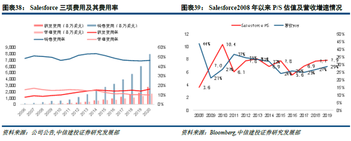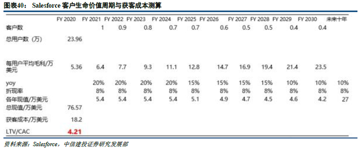 Salesforce在2010-2020财年的发展是一段还原整个订阅服务型企业生命三阶段周期的过程:2010-2014财年为发展的第一阶段,自2009年盈利开始下滑,2011年-2015年期间公司净利润持续亏损,主要原因在于SaaS模式发展前期,用户数大幅增加以及获客成本高所致,同时在此阶段销售费用以及研发费用率也在显著增长,虽然经营现金流仍然为正但从相对值角度来看同样也在持续下滑。2014-2016财年为发展的第二阶段,以2013年为拐点,销售及研发费用率已经从上升转为下降趋势,净利润亏损趋势也不再扩大,现金流增长速度开始提升,总体而言经营效率提高,2015年公司用户突破15万,相比2000年增长了近100倍,公司用户已达到一定体量,即将迈入第三阶段。2018财年至今公司已进入稳定发展期,研发费用率及销售费用率基本上稳定在15%及46%左右,收入、净利润以及经营现金流虽有波动但总体呈现良好的增长态势。最后经测算Salesforce的LTV/CAC比率约4.21,处在健康范围内。