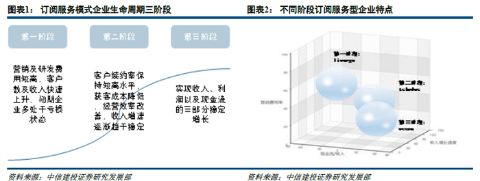 订阅服务型企业在不同发展阶段估值方式会有相应的变化: