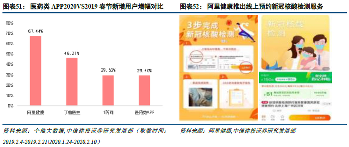 阿里健康APP春节新增用户同比增长67%,助力复产复工推出线上预约新冠核酸检测服务。1月24日晚,阿里健康联合支付宝紧急上线在线义诊服务,4天内超过160万人访问在线义诊,部分医生平均每天接诊200人,1月26日,阿里健康又增开手机淘宝的免费在线问医入口,1月29日当天,在线问医平台就突破70万访问量和10万问医量,随后推出的“放心购药”计划以及专为海外侨胞开通的在线医疗咨询专区等服务均为阻断疫情传播以及缓解医疗机构压力方面做出了努力,根据个推大数据显示,今年阿里健康APP新增用户与2019年春节相比同比增长67%,高于行业平均水平29%。4月21日,阿里健康表示已联合美年大健康天猫旗舰店、迪安健检天猫旗舰店等,面向淘宝用户推出在线预约新冠核酸检测的服务,全国近70个城市的企业和个人可以在支付宝、淘宝、天猫和夸克搜索“新冠核酸检测”便可预约检测地点与时间,检测后最快24小时内就能拿到电子报告,聚划算百亿补贴后最低价只要99元。