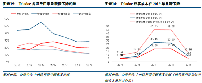 从Teladoc近七年的收入、利润以及现金流状况来看,Teladoc在前期收入经历了一段波动但高速增长的阶段,同时经营性现金流及净利润均入不敷出,但企业自2017年起亏损开始不再扩大,费用率呈下降趋势,同时获客成本也不再快速上升,代表着Teladoc已经进入第二阶段。直至2019年Teladoc迎来一个转折点,即经营性现金流转负为正,净利润也较18年收窄了近9%,意味着Teladoc开始逐步进入第三阶段,规模经济开始凸显,首先从pmpm来看,由于19年与UNH合作会员数的增加而收入并未确认至全年,因此对2019年的pmpm计算有稀释作用,企业调整后的pmpm为1.19,较2018年增长14.4%,会员数及会员利用率均有所提升,特别是会员数,同比增长61%,较2018年显著增加了1390万,销售费用率还较2018年下降了2个百分点,这也使得Teladoc对于付费会员数的获客成本在近六年的时间里出现了首次下滑,可见客单价的提升、获客成本的降低以及会员的利用率(留存率)是决定企业是否能从第二阶段到第三阶段跨越的重要因素。