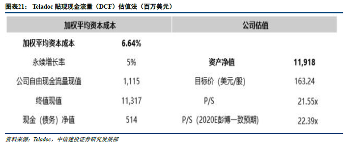 从未来发展方向来看,据Teladoc测算,依据人口基数Teladoc在美国还有近82%的市场空间可深挖,国际市场的发展正在起步阶段,占比不高还需进一步探索,预计未来公司整体毛利率将大致稳定在60%左右,因此经测算订阅收入占比约为70%,最后根据贴现现金流量估值法对Teladoc进行估值,得出当前Teladoc的P/S值约为21.55。