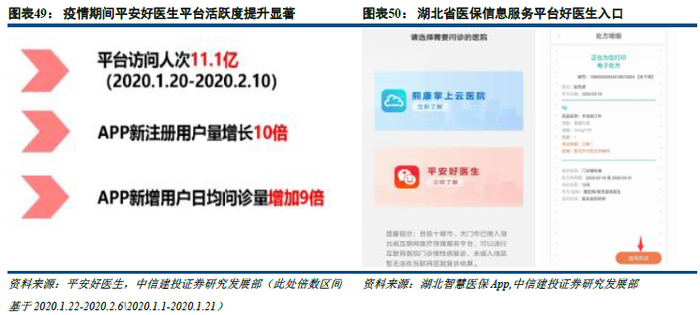 平安好医生成为首个打通省级医保在线支付的第三方互联网医疗平台。疫情期间,平安好医生新增用户和活跃用户方面增长迅速,平台累计访问人次达11.1亿,APP新注册用户量增长10倍,日均问诊量是平时的9倍。而为满足新冠疫情下市民们的就医需求,2020年3月28日,湖北省医保局上线全国第一个开通互联网医疗医保在线支付的升级医保平台——“互联网医疗保障服务平台”,三天后,2020年3月31日,平安好医生宣布旗下互联网医院打通湖北省医保在线支付,具有慢性病资格的患者在“门慢复诊”入口可进入好医生app进行在线问诊,在医生开具处方后即可进行医保报销支付,除此之外,此前平安好医生已与福州市政府成立全国首家区域互联网医疗服务平台并拿到了福州市平台运营权,此次与湖北省医保的打通加快了平安好医生原本的步伐。