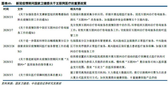 新冠疫情期间国家助力互联网医疗发展。中国国内疫情从12月开始被发现,1月23日武汉封城,2月左右进入爆发期在经历了近两个月的努力现在疫情已经基本得到控制。疫情期间国家接连发布政策,加速催化互联网医疗服务保障居民健康,国家首先在2月初起就接连发布三项通知大力推动规范发展互联网在线诊疗服务,并于3月2日号召全国推进部分规定的“互联网诊疗”服务费用纳入医保结算支付,支持定点医药机构提供“不见面”就医购药服务,探索推进定点零售药店配药直接结算,按照统筹地区规定的医保政策和标准,分别由个人和医保基金进行结算,助力疫情防控。以及3月5日号召建立高效的医保支付机制并加快发展商业健康保险等一系列动作,推动并保证医保在线支付的发展,可见此次疫情加速催化互联网+医疗健康的发展脚步,疫情期间,国家卫健委属管医院互联网诊疗比去年同期增加了17倍,第三方互联网服务平台诊疗咨询量也比同期增长了20多倍。