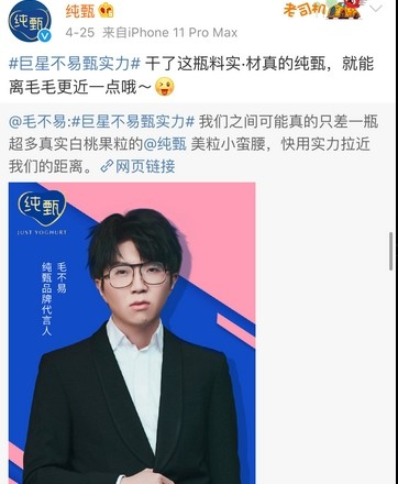 如今,罗志祥似乎坑蒙牛坑的更惨,4月22日刚刚官宣蒙牛旗下高端酸奶品牌纯甄官宣罗志祥为新代言人。第二天就被“罗志祥人设崩了”打得措手不及。