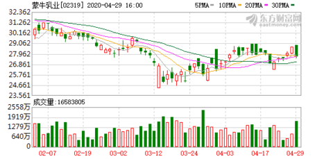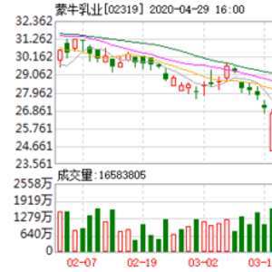 截至4月29日收盘,蒙牛乳业(02319)下跌3.66%,报27.650港元/股。