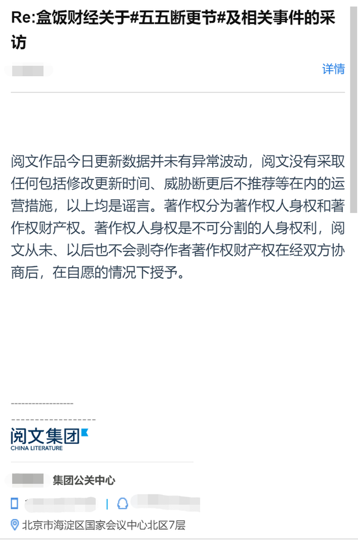这点与盒饭财经就相关问题采访阅文集团后,官方给予的邮件回复一致。