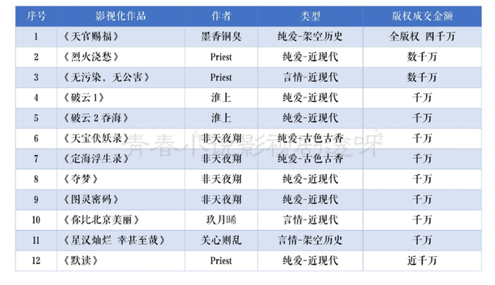 (来源见水印,原作者更正《天官赐福》的四千万并非全版权)