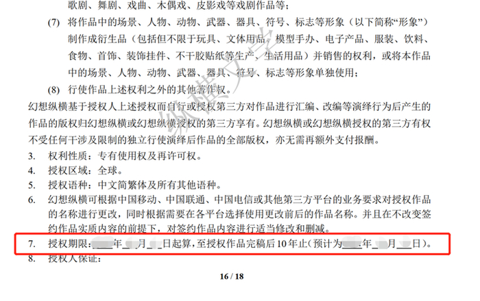 这份合同中,约定的授权内容,与阅文的合同大同小异,也基本是将签约作品的除署名权之外的全部权利独家授权给平台。但与阅文的合同有所区别的是授权期限,阅文约定的是“著作财产权保护期”,而纵横文学有具体的约定期限10年。