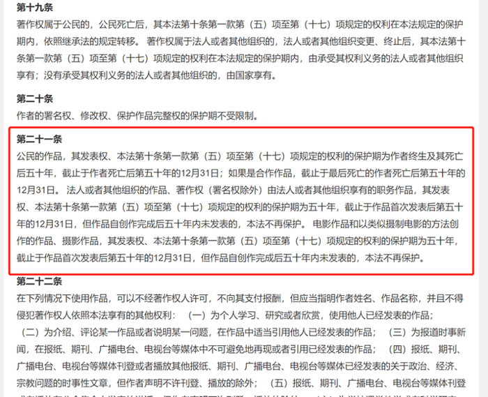 阅文合同中的这项规定来看,大部分作者适用的是《中华人民共和国著作权法》第二十一条中的“死后50年”。当然,如果合同中另协商约定的,期限另算。但,可惜的是,并未在合同中,看到此类约定。