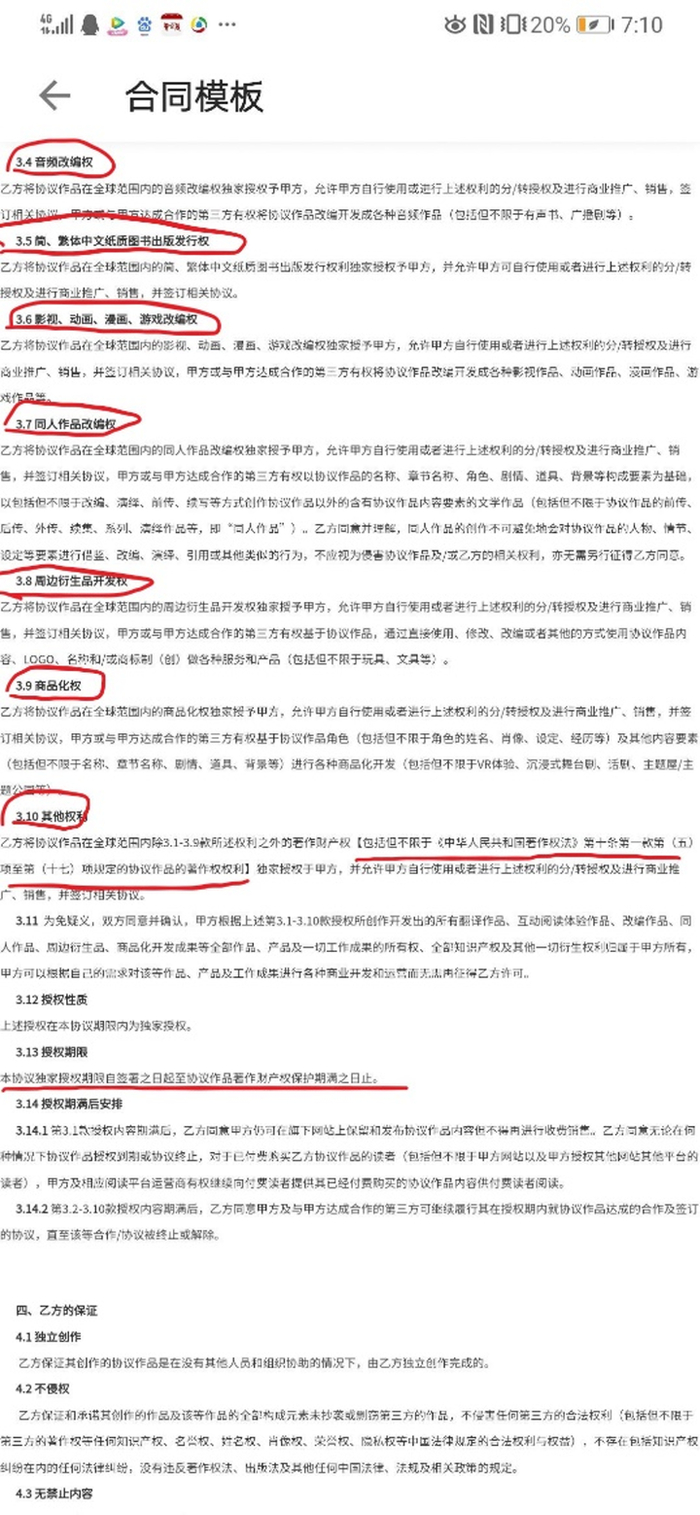 粗看“授权内容及期限”这部分内容,还未细看报酬结构、优先权、违约责任等合同条款规定,就已发现了这些问题。(碍于篇幅,合同中的条款就不一一拆解分析,有兴趣的小伙伴可在后台留言“合同”二字。)