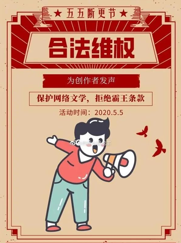 在阅文回应的当天,大批网文作者发起了“五五断更节”活动,宣布在今天全部停止更新,以此维护自己的版权和著作权。根据网友制作的各种有关“五五断更节”宣传资料,大家之所以“断更”,是为了抵制阅文集团的霸权合同、维护写手合法权益。