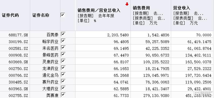 图表三:沪深股市医药制造业销售费用率前十企业情况