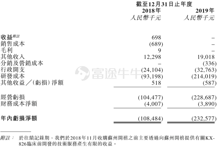 公司的产品均处于临床阶段,尚未有收入。公司过去两年净亏损分别为1.08亿和 2.33亿人民币,亏损扩大主要是由于研发成本的大幅提高,2018年至2019年,公司研发成本由9319.8万元增至2.14亿元,同比增长129.6%。