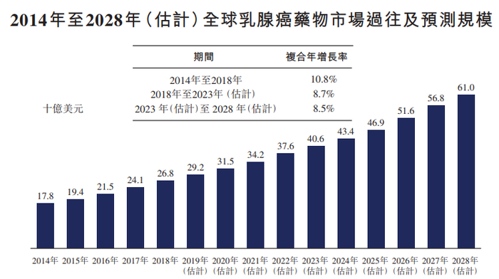 2018年全球乳腺癌发病率达210万名患者,且预期2028年将增加至250万名患者。2018年全球乳腺癌药物市场规模达268亿美元(1876亿人民币),年复合增长率为8.7%。
