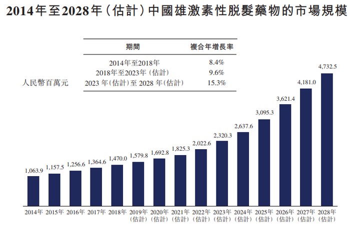 2018年,中国雄激素性脱发药物的市场规模为人民币14.7亿元,预计2023年的规模达到23.2亿元。2018年美国接受米诺地尔治疗的患者为70%,每名患者199美元/年,使用非那雄胺费用为314美元/年。