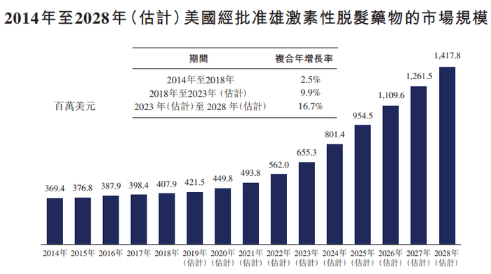 2018年美国雄激素性脱发药物的市场规模为407.9百万美元(28.5亿元),预计2023年的655.3百万美元(45.8亿元)。2018年美国接受米诺地尔治疗的患者为75%,每名患者282美元/年,使用非那雄胺费用为1,183美元/年。