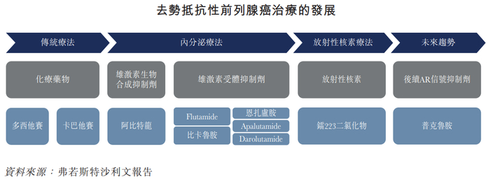 CRPC的治疗方法过去有使用化药的传统疗法,目前的治疗方法有内分泌疗法和放射性核素疗法,主要以内分泌疗法为主。