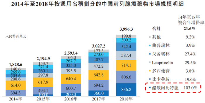 中国的前列腺癌药物市场集中,排名前六位的中国前列腺癌药物市场市场份额为95%。其中,阿比特龙是2018年市场份额20.9%,排名第一,且为仿制药居多,年复合增长率为103%。主要原因是阿比特龙2017年开始进入国家医保目录以及有效的学术推广。