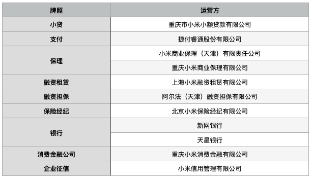 据消金时代梳理,小米已拥有小贷、支付、保理、融资担保、保险经纪、企业征信、银行、消费金融等九类金融牌照,金融布局逐步完善。