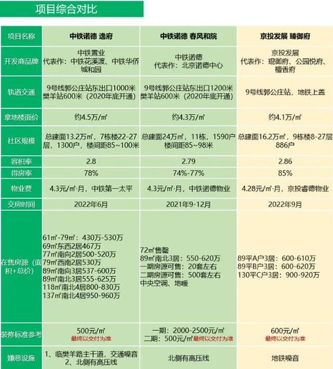 对于房屋品质问题,除了购房者个人对于开发商认同感,开发商拿地时的溢价率可以作为参考标准(溢价率越高,开发商利润空间越小),从数据上看:中铁诺德·逸府(26.29%)>中铁·诺德春风和院(25.36%)>京投发展·臻御府(13.52%)。