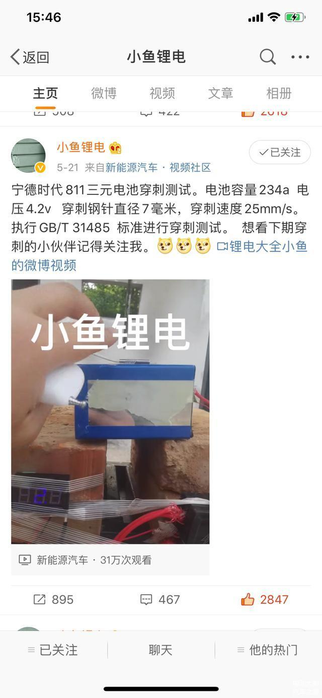 这场中国动力电池领域头部两强的“隔空约架”,不仅引发了双方支持者的网上“口水战”,还有一位个人锂电池爱好者@小鱼锂电,自行购买了宁德时代811三元电池进行了穿刺试验,其结果自然是引起了更大的轰动。